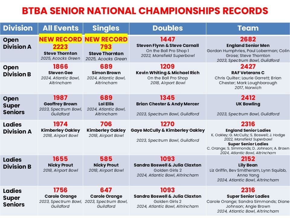 We bowled on a Brunswick conversion of Beaten Path, which proved to be quite challenging for some and very scoreable for others. Superb bowling from Steve Thornton saw him set new records in both the Open Division A All Events and Singles with scores of 2223 & 793! (se table below…)